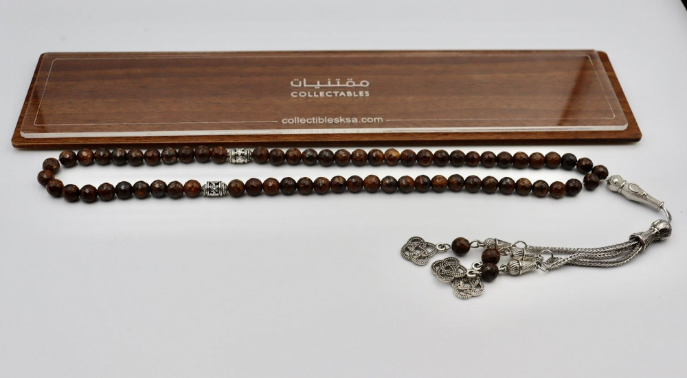 تم صقل احجار هذه السبحة بشكل مضلع ليضفي عليها مسحة من الجمال، بلون برونزي نادر وبحجم 6 مم تم تصميم هذه السبحة ذات 65 حجارة مميزة وشاهد من معدن (انتيمون) فضي وفواصل تجعل من شكلها النهائي تحفة فنية مثالية للاهداء أو الاقتناء. تأتي مع علبة فخمة تناسب قيمتها.