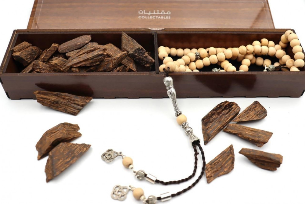 طقم هدية مكون من سبحة فواحة برائحة الصندل بحجم حبة 8 مم بعدد 99 حبة متقنة الصنع مع شاهد معدن (انتيمون) فضي واهداب وفواصل مميزة و اوقية عود الكلمنتان المحسن رائحته جدا جميلة وثابت الرئحة.