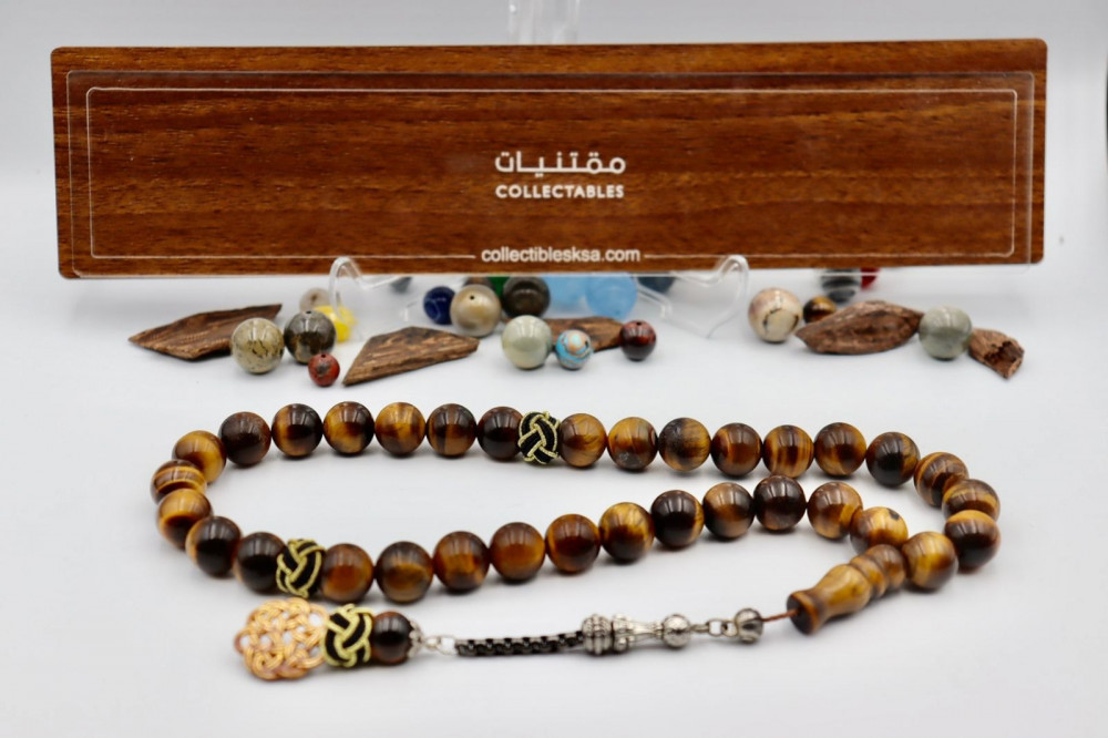 سبحة مصاغة من حجر عبن النمر المموج بحجم 14 مم وعدد 33 حجر مع شاهد مصقول بعناية من نفس الحجر، الفواصل والهدب مصنوع بحرفية للتناسق مع لون الحجر، يأتي داخل علبة مميزة للاهداء.