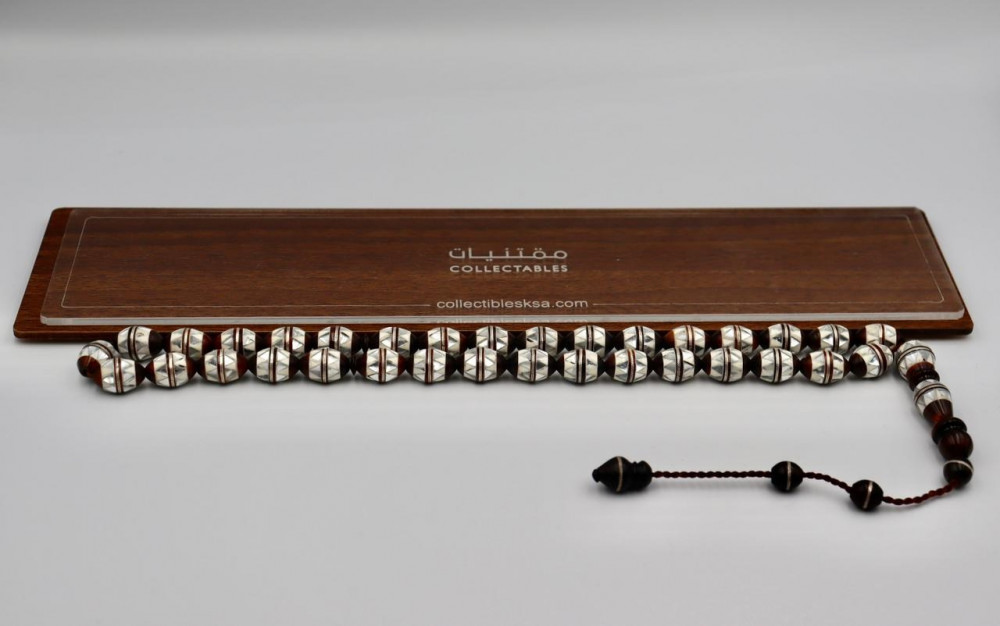 سبحة تتطلب الكثير من الجهد في الصياغة لتظهر جمال تطعيم خشب الكوك بالعظم والصدف مع حزام جميل من الفضة يزين 33 حبة مصنعة من خشب الكوك الأسمر بهدب ممتد يضفي المزيد من الطول على السبحة، تمتاز الحبة بحجم 9 مم شبة دائري ينساب بانسجام مع تصميم السبحة، من اجمل ما يمكن ان يهدى او يقتنى من السبح، تاتي السبحة في علبة فخمة تتناسب مع قيمتها الفنية.