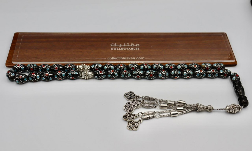 سبحة كوك حرص المصمم على زخرفتها بالمرجان والفيروز مع تطعيمها بخيوط الفضة لتظهر كل حبة بمظهر انيق يشكل سبحة ذات 33 حبة كبيرة الحجم 12 مم، ومزينة بفواصل معدن (انتيمون)، تتدلى اهداب من السبحة لتعطي فخامة للسبحة تتناسق مع يد حاملها، السبحة تحفة فنية تطلب صنعها الجهد والوقت لذلك تاتي بعلبة فخمة تناسب قيمتها الفنية.