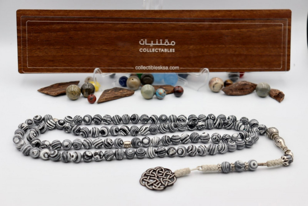 سبحة مكونه من 99 حجر فيروز طبيعي بحجم 8 مم مصقول بعناية واحترافية تظهر تعرقات الحجر الطبيعي بشكل مثالي ليناسب مقتنيي ومحبي حجر الفيروز الطبيعي بشكلة المثالي، تم تزيين الشاهد المعدني والفواصل اما الهدب فقد تم تصنيعة من طرابزون بنفس لون الحجر ليظهر فخامة هذه القطعة الفنية، وللحفاظ على متانتها تم تصنيعها من خيط معدني مرن يتوافق وينسجم مع الشكل النهائي للسبحة، تأتيكم ضمن علبة فخمة مناسبة للإهداء.