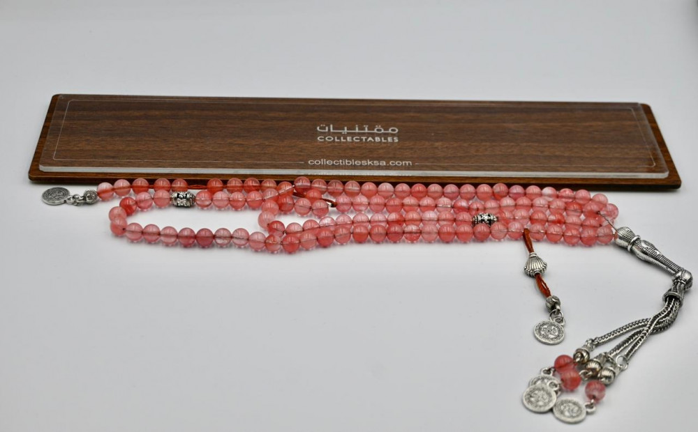بعيدا عن السبح التقليدية، تم تصميم هذه السبحة من 99 حجر عقيق عسلي شفاف مصقول بحجم 6 مم، وبشاهد وفواصل من معدن (انتيمون) تمتاز بلون غير تقليدي يظهر تميز واناقة مقتنيها، سبحة ممتازة للايادي الناعمة ومثالية للاهداء، يتم حفظها بعلبة جميلة تتناسق مع قيمتها الجمالية.