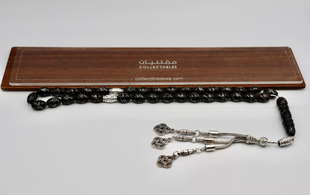 سبحة يسر تقليدية تضفي على مقتنيها طابع الشخصية الرسمية في المناسبات بحجم 9 مم لكل حجر تم تطعيمة بالفضة، السبحة مزينة بشاهد من اليسر المطعم بالفضة بنفس النقشة لتتناسق بشكل مثالي، تتدلى من الشاهد اهداب من معدن (انتيمون) فضي ليزيد من جمال وفخامة السبحة، تأتي ضمن علبة فاخرة مناسبة للإهداء.