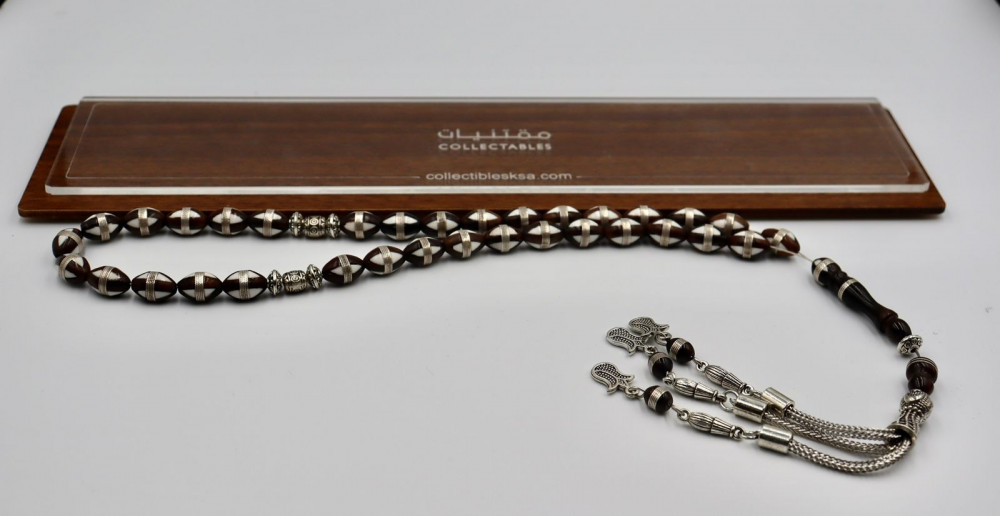 بالكثير من الابداع قام مصمم هذه السبحة باستخدام حبات الكوك متقنة الصنع والمطعمة بالعاج والفضة التي شكلت حزاما يلتف بدقة متناهية على 33 حبة شكلت سبحة بمنهى الاناقة والرقة بالاضافة الى اضفاء بعدا رسميا لمن يحملها، يكون الشاهد من نفس الخامة جزء اساسي من رونق السبحة، وتتدلى منه اهداب فضية متناسقة مع طراز سبح الكوك، تأتي ضمن علبة فاخرة مناسبة للإهداء.