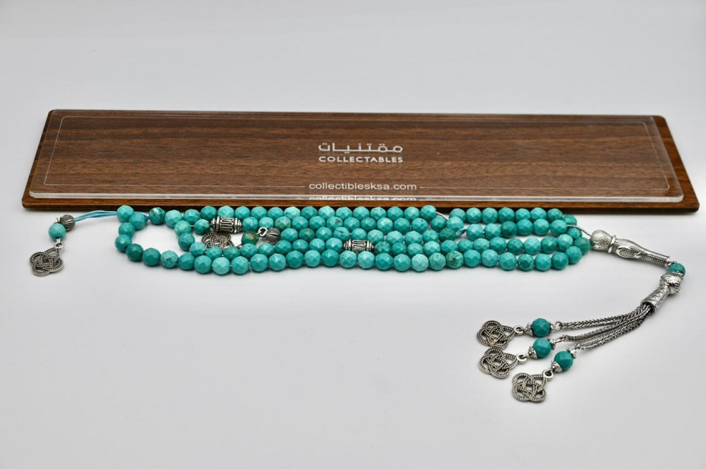 سبحة حجر فيروز طبيعي تم صقل كل حجر بشكل مضلع لتضفي الفخامة على السبحة ذات 99 حجر بحم 6 مم، مزودة بشاهد وفواصل من معدن (انتيمون) وتتدلى اهداب السبحة بشكل انيق مناسبة للايادي الناعمة، مغلفة بعلبة قيمة تليق بجمال هذه التحفة المثالية للاقتناء أو الإهداء.