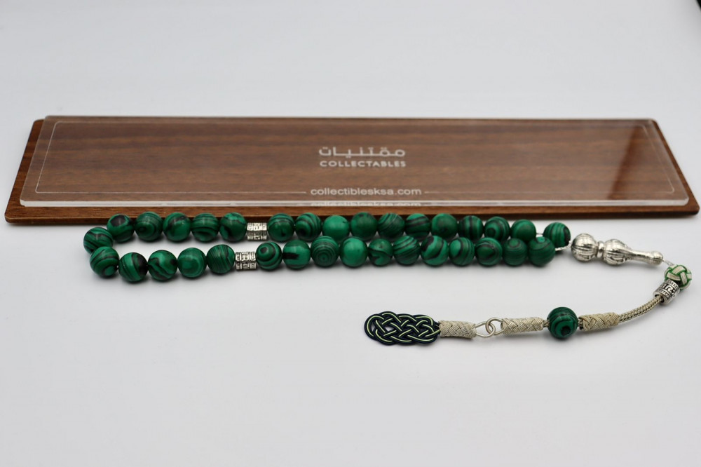 يعتبر حجر الملاكيت الاخضر من اجمل الاحجار الطبيعية ذات العروق الجميلة التي صنعت منها هذه السبحة ذات 33 حجر بحجم 10 مم صقلت كل منها بعناية يظهر جمال هذا الحجر الطبيعي، اضافة المصمم هدب طرابزون منسجم مع لون السبحة اضفى فخامة وجمال على هذه القطعة الفنية التي تأتي داخل علبة مثالية ومناسبة للاهداء.