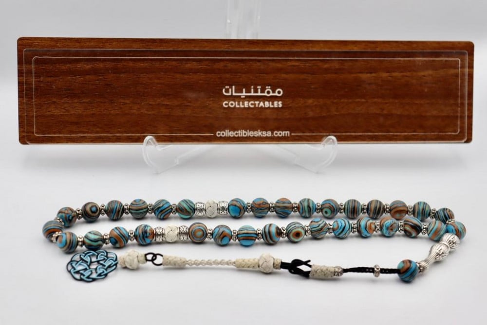 سبحة مكونه من 33 حجر فيروز طبيعي بحجم 10 مم مصقول بعناية واحترافية تظهر تعرقات الحجر الطبيعي بشكل دائري يناسب مقتنيي ومحبي حجر الفيروز الطبيعي بشكلة المثالي، تم تزيين الشاهد المعدني والفواصل والاهداب بلون جذاب من الطرابزون ليظهر فخامة هذه القطعة الفنية، وللحفاظ على متانتها تم تصنيعها من خيط معدني مرن يتوافق وينسجم مع الشكل النهائي للسبحة، تأتيكم ضمن علبة فخمة مناسبة للإهداء.