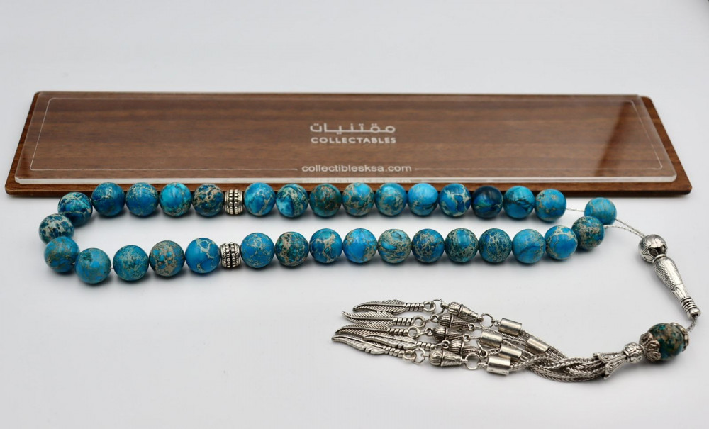 سبحة مميزة بحجم حجر 12 مم مصنوعة من حجر اليشب فيروزي اللون بتعرقات طبيعية بعدد 33 حبة بشاهد وفواصل من معدن (انتيمون) تمتاز بهدب يتدلى ليزيد من فخامة هذه القطعة الفاخرة، تأتي داخل علبة هدايا جميلة.