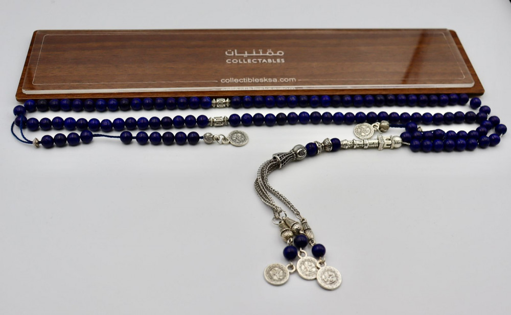 سبحة من حجر اللازورد الكحلي المميز بحجم 6 مم وعدد 99 حجر وعداد وعلامة وقف مزينة بشاهد معدن (انتيمون) على شكل مأذنة تتدلى منها هدب مزين بنفس النوع من الحجر ليضفى عليها المزيد من الفخامة والجمال، تأتي مع علبة فخمة مناسبة.