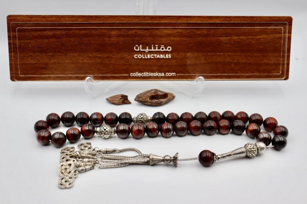سبحة مصاغة من حجر عبن النمر المموج بحجم 12 مم وعدد 33 حجر مع شاهد مصقول بعناية من نفس الحجر، الفواصل والهدب مصنوع بحرفية للتناسق مع لون الحجر، يأتي داخل علبة مميزة للاهداء.