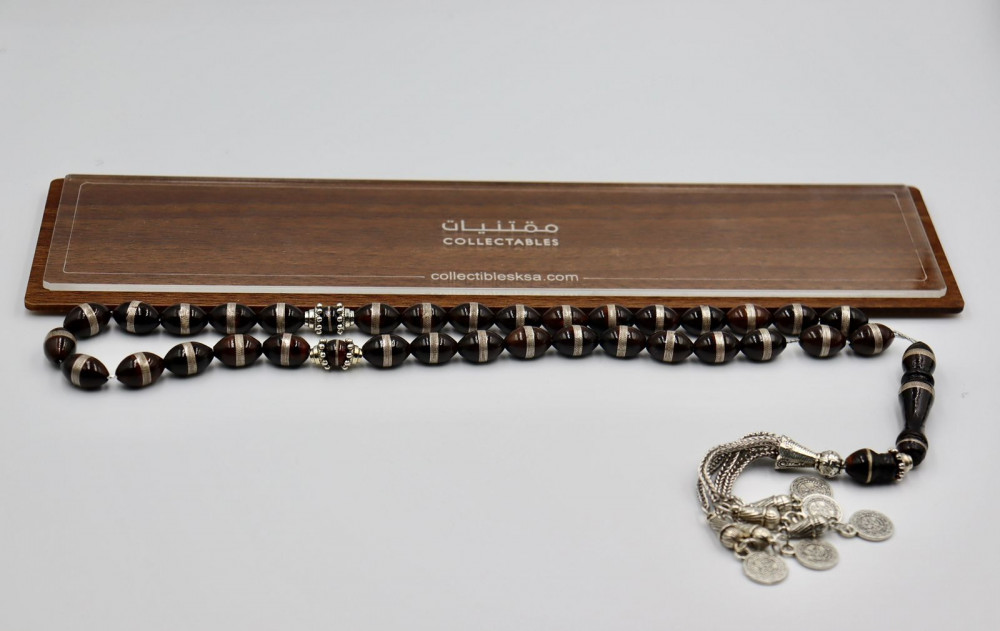من خشب الكوك الأسود تم تصنيع هذه السبحة وتم تطعيمها بخيوط الفضة لتشكل حزاما راقيا يضفي على كل حبة مظهرا رائعا لتشكل في النهاية تحفة من سبحة ذات 33 حبة وهدب فخم من معدن (انتيمون) ينساب مع حجم الحبة 9مم، تمتاز بفواصل من الكوك المطعم بالفضة، مناسبة للاهداء لمفتني السبح او القناة المتميزين، تأتي مع علبة فخمة مناسبة للإهداء.