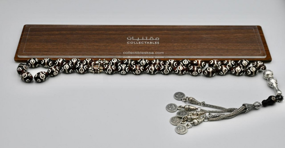 من اجمل سبح الكوك المطعمة بالعظم والمحزمة بالفضة بشكل مهاري بحجم حوالي 9 مم وعدد 33 مع فواصل معدن (انتيمون) واهداب متدلية بانسيابية تضفي فخامة لمقتنيها وتعير عن ذوقة الرفيع. مثالية للاهداء أو الاقتناء، تأني بعلبة فخمة مناسبة للاهداء.