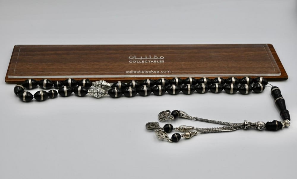 من خشب الكوك الأسود تم تصنيع هذه السبحة وتم تطعيمها بخيوط الفضة لتشكل حزاما راقيا يضفي على كل حبة مظهرا رائعا لتشكل في النهاية تحفة من سبحة ذات 33 حبة وهدب فخم من معدن (انتيمون) ينساب مع حجم الحبة الكبير، مناسبة للاهداء لمفتني السبح او القناة المتميزين، تأتي مع علبة فخمة مناسبة للإهداء.