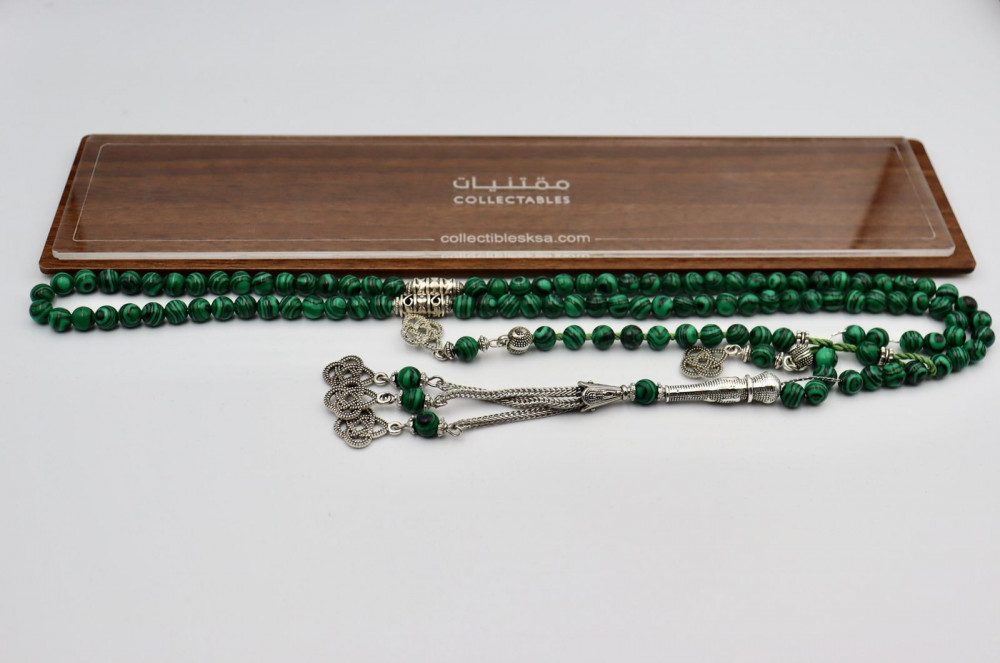 سبحة مصنعة من حجر الملاكيت المصقول يظهر لونه الأخضر الجميل ومميز بعروق خضراء بحجم 6 مم وعدد 99 حجر مزين بشاهد معدن (انتيمون) وفواصل وعداد وعلامة وقف، وتتدلى منها هدب ليزيد من جمال هذه القطعة الفنية، تأتي داخل علبة هدايا فخمة.