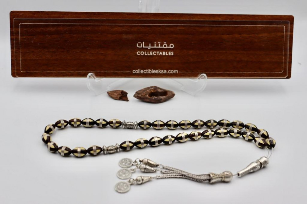 من اجمل سبح الكوك المطعمة بالعاج والمحزمة بالفضة بشكل مهاري بحجم حوالي 10 مم وعدد 33 مع فواصل معدن (انتيمون) واهداب متدلية بانسيابية تضفي فخامة لمقتنيها وتعير عن ذوقة الرفيع. مثالية للاهداء أو الاقتناء، تأني بعلبة فخمة مناسبة للاهداء.