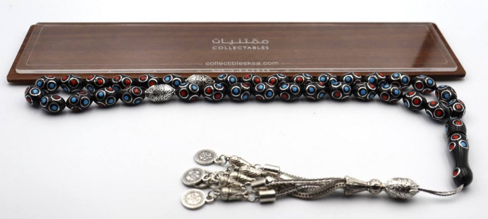 سبحة كوك حرص المصمم على زخرفتها بالمرجان والفيروز مع تطعيمها بخيوط الفضة لتظهر كل حبة بمظهر انيق يشكل سبحة ذات 33 حبة كبيرة الحجم 12 مم، ومزينة بفواصل معدن (انتيمون) يحتتضن قطعة صغيرة من الكوك الأسمر، تتدلى اهداب من السبحة لتعطي فخامة للسبحة تتناسق مع يد حاملها، السبحة تحفة فنية تطلب صنعها الجهد والوقت لذلك تاتي بعلبة فخمة تناسب قيمتها الفنية.