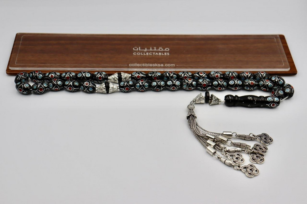 سبحة كوك حرص المصمم على زخرفتها بالمرجان والفيروز مع تطعيمها بخيوط الفضة لتظهر كل حبة بمظهر انيق يشكل سبحة ذات 33 حبة كبيرة الحجم 12 مم، ومزينة بفواصل معدن (انتيمون) يحتتضن قطعة صغيرة من الكوك الأسمر، تتدلى اهداب من السبحة لتعطي فخامة للسبحة تتناسق مع يد حاملها، السبحة تحفة فنية تطلب صنعها الجهد والوقت لذلك تاتي بعلبة فخمة تناسب قيمتها الفنية.