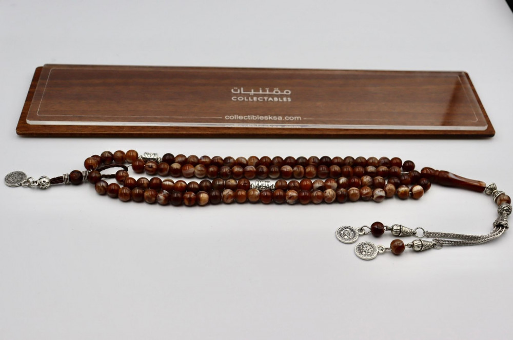 سبحة ذات رائحة عطرية دائمة ذات لون بني رخامي بحجم 6 مم وعدد 99 حبة خفيفة الوزن ومثالية لعاشقي السبح العطرية، شاهد مصمم بشكل متناسب ومصنوع بدقة وتناسق مع المظهر النهائي للسبحة، يتدلى هدب فضي من معدن (انتيمون) ليزيد من رونق وجمال هذه التحفة الرائعة التي تأتي ضمن علبة فخمة مناسبة للإهداء.