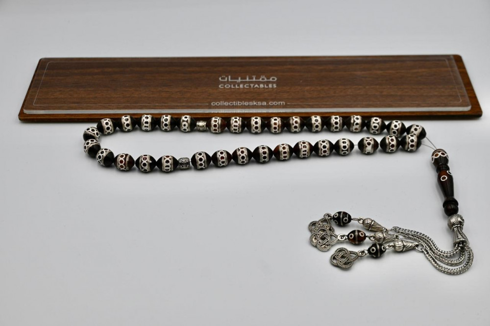 لعشاق الأناقة ومحبي التميز سبحة كوك مطعمة بالعاج ومحزمة بالفضة بحجم 8 مم وعدد 33 حبة مصنعة بمنتهى الدقة والاتقان، مع هدب فضي يزيد من طول السبحة ويتدلى بأناقة على يد حاملها، تاتي داخل علبة هدايا فاخرة مناسبة للإهداء.