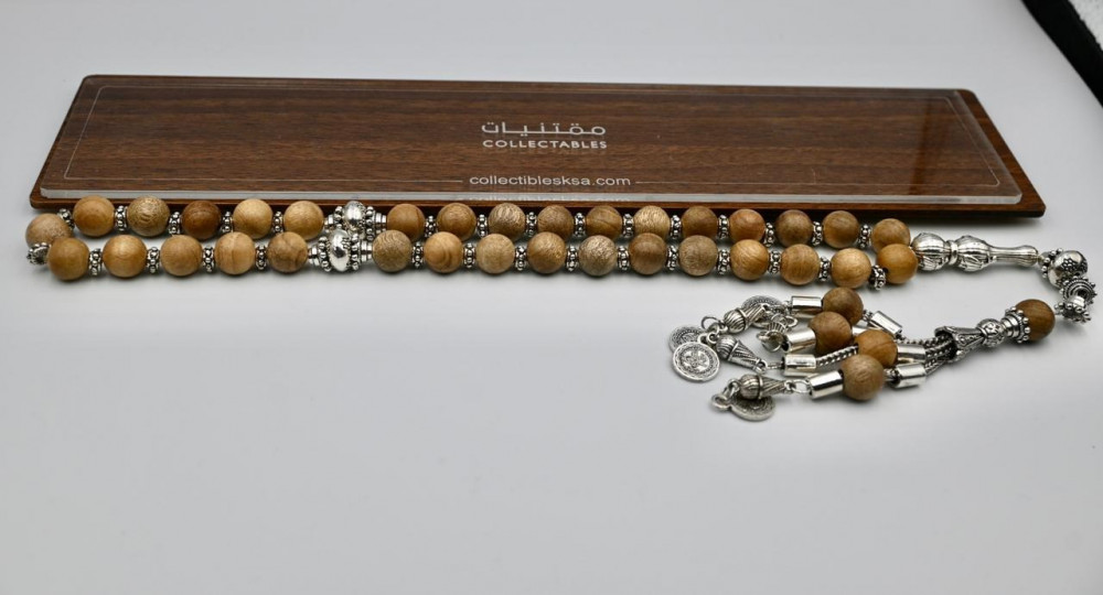 لعشاق السبح الخشب الطبيعية صممت هذه السبحة بعناية لتميز اصحاب الذوق الرفيع حيث حرص المصمم بادخال فواصل معدن (انتيمون) الفضي بين حبات السبحة ليضفي عليها الجمال، السبحة ذات مسامية عالية مما يجعل تعطيرها بدهن العود او ماء الورد مناسب حيث تحتفظ بالرائحة لمدة طويلة، بعدد 33 حبة وهدب متدلي باناقة صممت هذه السبحة للاقتناء او الاهداء، تاتيكم بعلبة جميلة تتناسق مع جمال هذه التحفة الفنية.